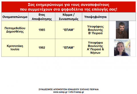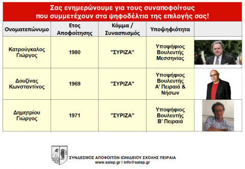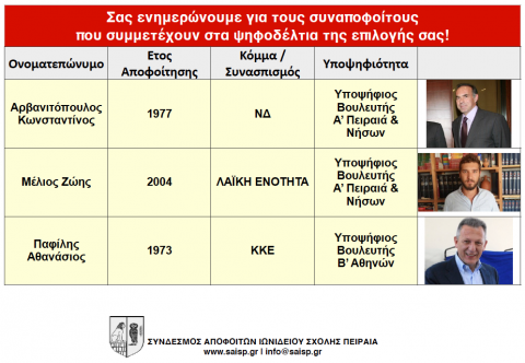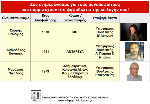 Ο Σύνδεσμος Αποφοίτων Ιωνιδείου Σχολής Πειραιά συνεχίζοντας μια παράδοση ετών, ενημερώνει τα μέλη και τους φίλους του Συνδέσμου και του Σωματείου για τους συναπόφοιτους και παλιούς καθηγητές που θα βρουν στα ψηφοδέλτια της δικής τους επιλογής. Στις συγκεκριμένες εκλογές δεν υπάρχει σταυρός προτίμησης αλλά λίστα. Αυτό δεν αλλάζει το βασικό σκεπτικό της συγκεκριμένης δράσης μας, που είναι η ανάδειξη της δράσης και συμμετοχής των αποφοίτων στο πολιτικό γίγνεσθαι.